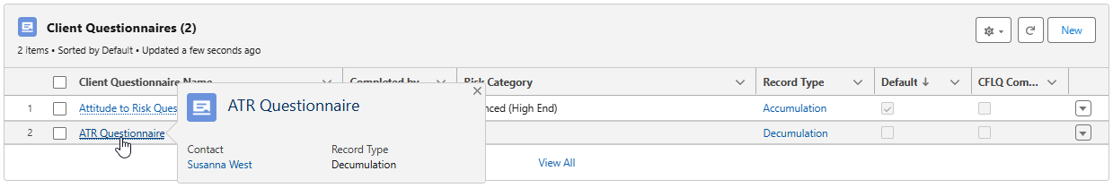 This will take you back to the contact record. To complete the questionnaire or send to a client to complete, click on the name of the questionnaire: